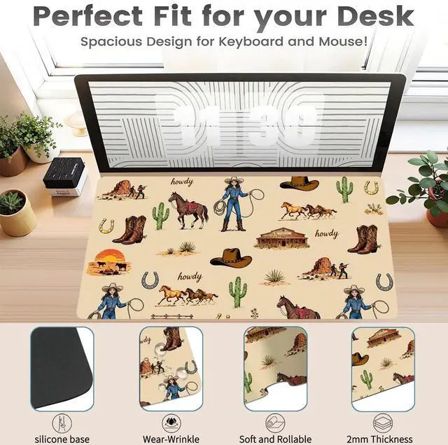 Pad Size: This Retro West Cowgirl desk pad measures 23.6 ''X 11.8 '' inch ( 60*30 cm). The keyboard and mouse pad is large enough to have a mouse, gaming keyboard, and shields your desk from scratches. Durable Non-Slip MaterialExpertly crafted from premium leather and faux suede, this Retro West Cowgirl large desk mat exudes durability. This stylish Farm Pattern large mouse mat firmly grips the desktop to ensure stable operation of your mouse and keyboard. It's specially designed for use on both sides, featuring a beautiful aesthetic print on the front, the back is solid color. creating a 2-in-1 desk pad. Waterproof & Easy to