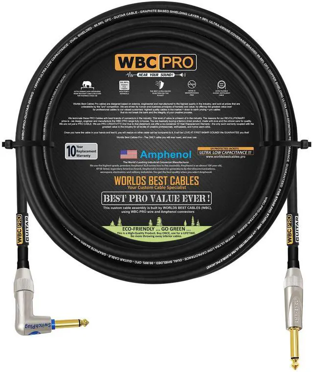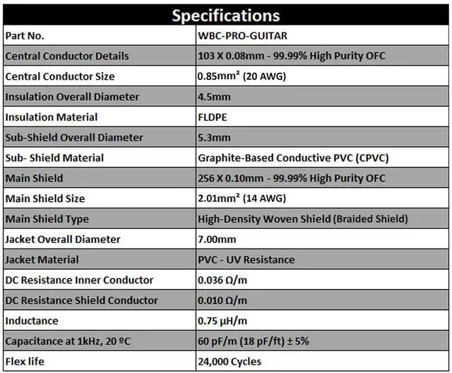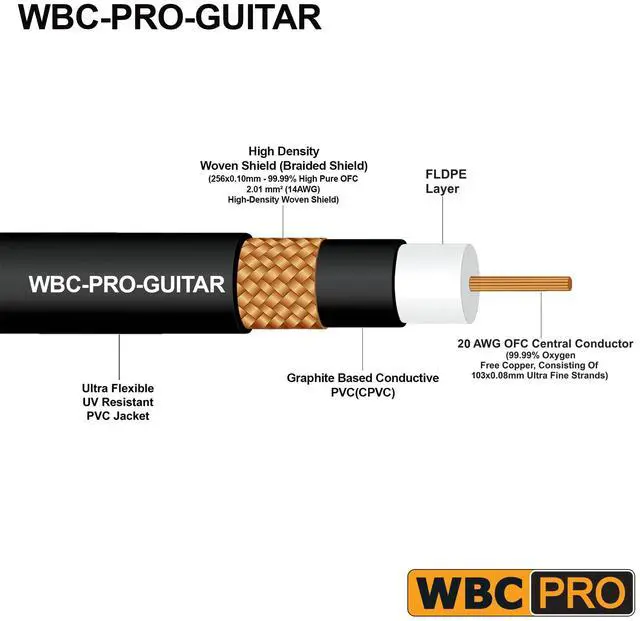 WBC-PRO-GUITAR is the Lowest Capacitance Pro-grade Graphite based instrument cable in the market & boasts an Ultra-Flexible UV-protected outer jacket, a dense braided shield (98% coverage) & a large 103 fine strands of 0.08 mm 99.99 % OFC core of 20AWG. Excellent shielding makes it suitable for even the most demanding stage/studio and cancels out all EMI & RFI, this cable encounters, resulting in the ideal tone for guitar/bass/instruments. Superior to Industry leaders like Mogami Platinum & 2524. ^^ WBC-PRO cables are designed based on science, engineered & manufactured in-house to the highest quality in the industry, and sold at prices that are unbeatable by the pro competition.
