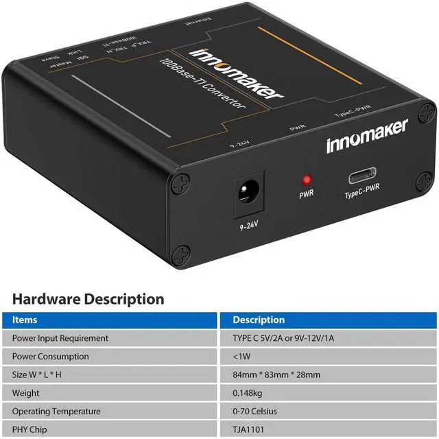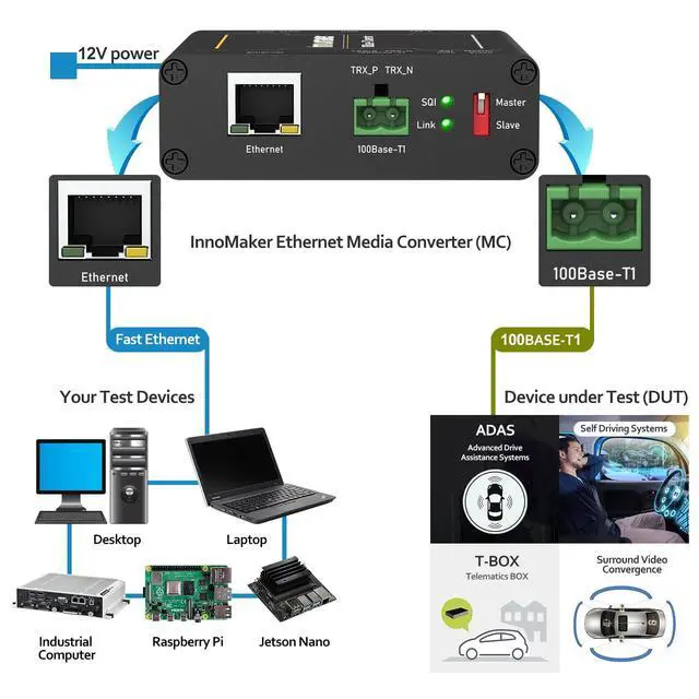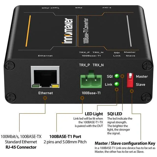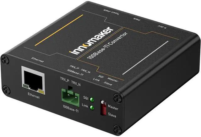 ^^ Features with 100BASE-T1 Master/Slave configuration and link LED. The design makes it portable and easy to install in test racks. The galvanized sheet steel with black powder coating housing makes it robust. ^^ Plug and Play, No need to install the drivers. No customized driver is needed to interact with our 100BASE-T1-TX-N Media Converter. The device communicates with standard Ethernet through an RJ-45 connector.