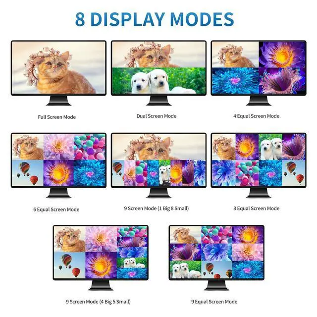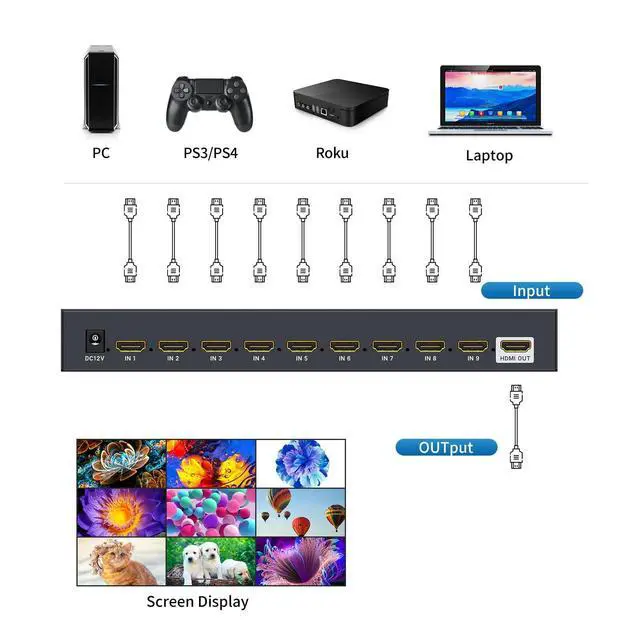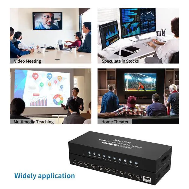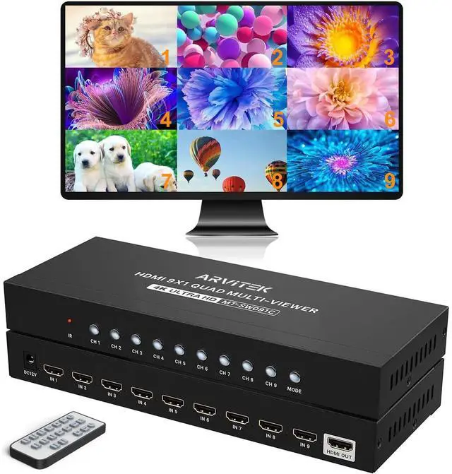 9x1 HDMI Multi-ViewerArvitek HDMI quad switcher 9 in 1 out is to connect 9 input sources and display on 1 HDMI output screen(monitor, projector, TV, etc. ) Plug and play, no drive need. ^^ 4K@30Hz High Resolution4K HDMI quad Multiviewer provide visual feast at 3840x2160@30Hz, 1920x1080@60Hz and downscaling. Compatible HDMI 1.4 and HDCP 1.4. ^^ Seamless Multiviewer SwitcherYou can control the 4K HDMI seamless switch in 2 different methods: Button Switch and IR remote. Also supports 50ft connection distance and 15ft IR remote switch. ^^ 8 Display ModelsYou can enjoy 8 display model on this