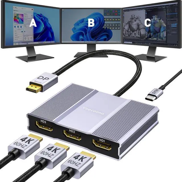 3. Plug the DP connector into your PC's DisplayPort. ^^ Premium Aluminum HousingThis Multi-Screen Display Adapter boasts top-tier construction with a nylon-braided cable, integrated aluminum alloy shell, and gold-plated ports. The nylon-braided cable boosts durability and resists scratches and cable damage, while the aluminum alloy shell delivers excellent heat dissipation to prevent overheating issues and minimize signal loss for lossless transmission. Gold-plated ports ensure ultra-stable, interference-free signal transfer for consistent performance. ^^ Wide CompatibilityThis DisplayPort splitter features premium chips, offering full compatibility with all devices equipped with DP/DP++/DisplayPort++ source portsincluding desktops (HP, Dell, Lenovo) and graphics cards (AMD, NVIDIA). It enables simultaneous connection to three HDMI-enabled devices such as TVs, monitors and projectors.