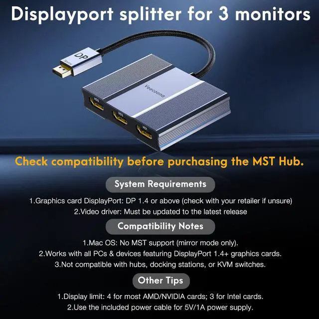Note: Requires connection to a 5V 1A power supply; a USB-C power cord is included in the package. ^^ Plug and PlayThe DisplayPort Splitter for 3 Monitorsfeatures plug-and-play functionality, incompatible with docking stations/hubs/adapters.