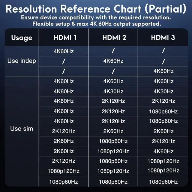Note: PCs with integrated GPUs only support mirroring mode or can extend display to just one monitor. ^^ 4K Ultra HD ResolutionThis hdmi splitter extended display delivers stunning 4K@60Hz ultra-high definition, supporting simultaneous use of up to three monitors for vivid, high-contrast visuals and vibrant color reproduction. It also offers seamless backward compatibility with 2K@120Hz/60Hz and 1080P@120Hz/60Hz resolutions.