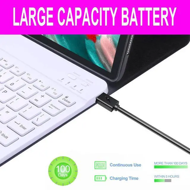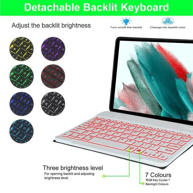 • BACKLIT BLUETOOTH KEYBOARD CASE: The removable keyboard is used as part of the stand for the tablet. Move the keyboard more forward or backward along the cover of the case, you can adjust the angle of the tablet to your preference. 7 colors backlight and 2 levels of brightness allow you to choose, you can adjust as you like