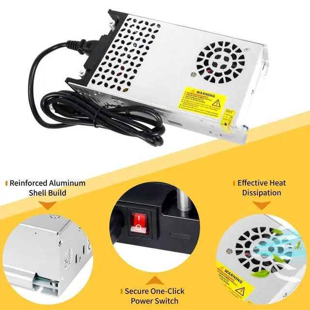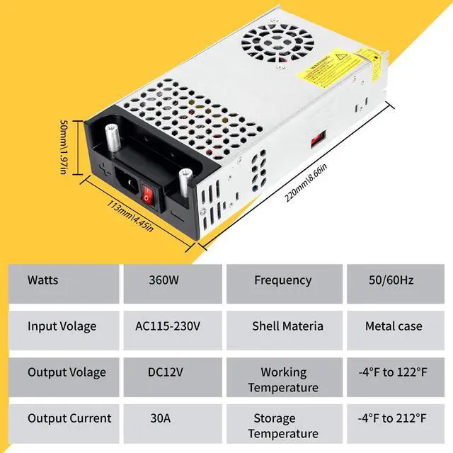 Adjustable VoltageInput voltage: 110V/220V100-140V/185-265V; Output Range (12V 1A-5A, 12W-60W ) or (12V 10A-30A 120W-360W), voltage input will adjust automatically to SMPS Model, Output current can be selected according to your needs, such as 30A 360W ^^ Fast Cooling System360W Power Supply Converter Aluminum Shell are designed with many heat dissipation holes, Built-in Cooling fan and dust-proof net, which effectively prevent dust from entering, ensure the stable rotation of the electric fan and prevent the circuit board from burning; moreover, anti-skid pads are added to the bottom in this 110v to 12v converter, which can also make the bottom better heat dissipation and work more stable.