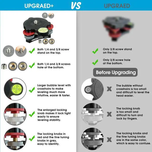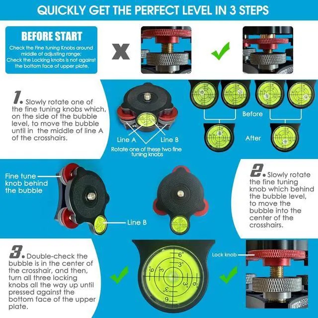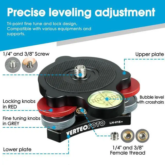 SUPPORT 1/4" and 3/8" for Top and BottomCompatible with 1/4" and 3/8" thread both on the top and at the bottom. ^^ Larger bubble level with crosshairLarger bubble level with crosshair to make leveling much more intuitive, easier & faster. ^^ Enlarged locking knobs in red & Fine-tuning knobs in greyThe enlarged locking knobs make it easier to lock for leveling stability. Use different colors to better identify between the lock knobs and the fine-tuning knobs. ^^ 6 degrees leveling fine adjustmentThe tri-point fine leveling design allows for precise leveling up to 6 degrees adjustments.