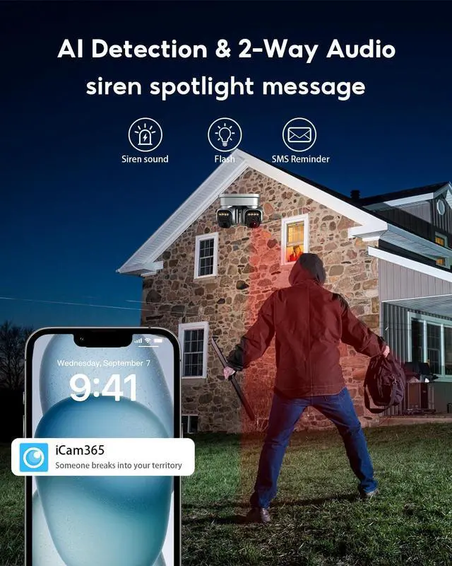 Color Night Vision: Monitor your property at any time with stunning 2K color night vision, ensuring crystal-clear images even in low-light conditions. Equipped with both white and infrared lamps, it provides three night vision modes (Full-color, Infrared, Intelligent), with automatic light activation in low-light conditions and a night vision distance of up to 35ft. ^^ AI Detection & 2-Way