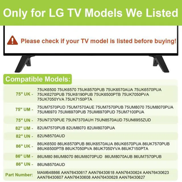 Important Notes -- Only for LG 75" 82" 86" TV models we listed! Not universal TV legs! It's important to verify that your TV model is included in the list of compatible models provided in the description. This step will save you time and prevent unnecessary returns.