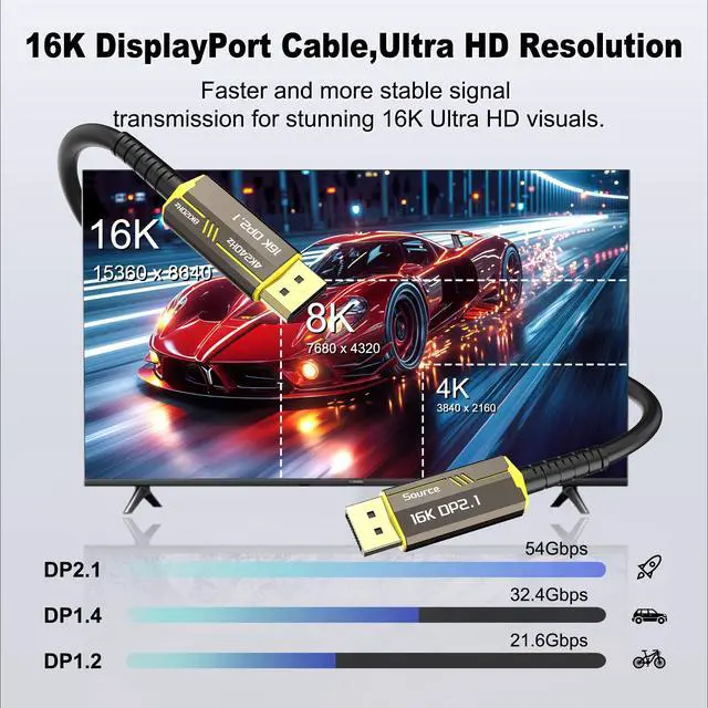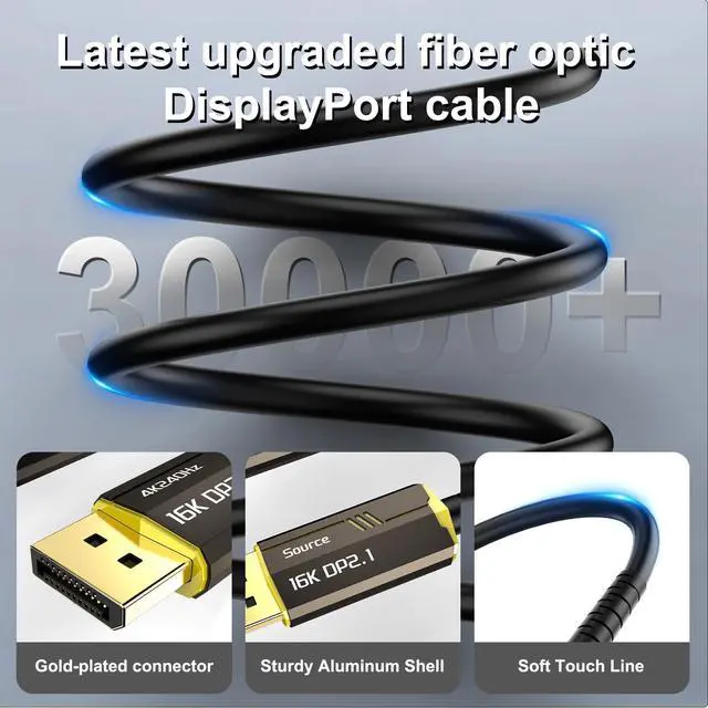 8K Fiber Displayport Cable Display port to display port cable 50ft supports High-speed 54Gbps, It is support 16K@60Hz, 10K@60Hz, 8K@60Hz/120Hz, 5K@60Hz, 4K@240Hz / 165HZ / 144Hz / 120Hz / 60Hz, 2K@360Hz / 240Hz / 165Hz / 144Hz. Support for Display Stream Compression (DSC), Forward Error Correction and HDR meta transport. Backward compatible with DisplayPort 2.0, 1.4, 1.3, 1.2.