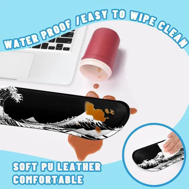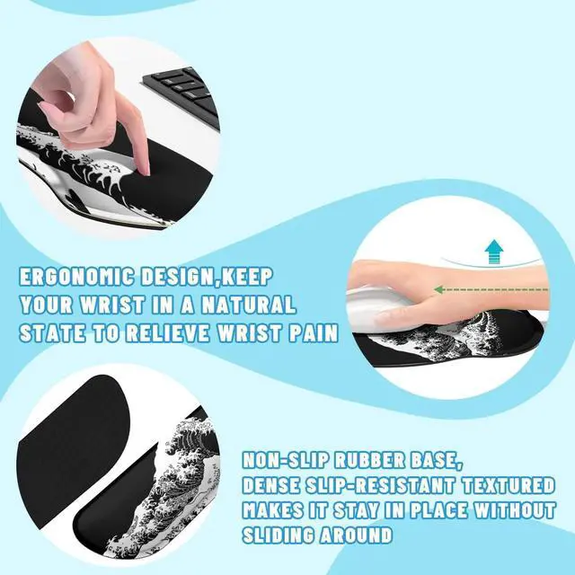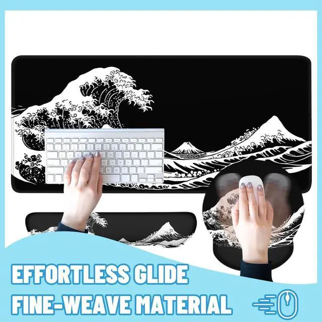 4-in-1 Wave Gaming Mouse Pad SetThis value set includes a large desk mat ( 35.4 15.7 in), keyboard wrist rest ( 17.3 3.74 in), mouse wrist pad ( 6.89 3.74 in), and coaster ( 3.9 3.9 in). The extended mouse pad provides generous space for your keyboard, mouse, phone, and coffee cup, keeping your desk organized and enhancing both work efficiency and gaming performance. ^^ Ergonomic Wrist Support DesignThe mouse pad and wrist rests are ergonomically shaped to fit the natural curve of your wrist, providing gentle support and reducing pressure during long hours of typing or gaming.
