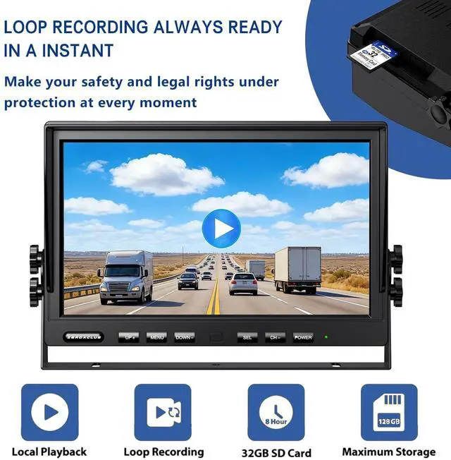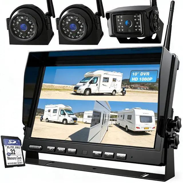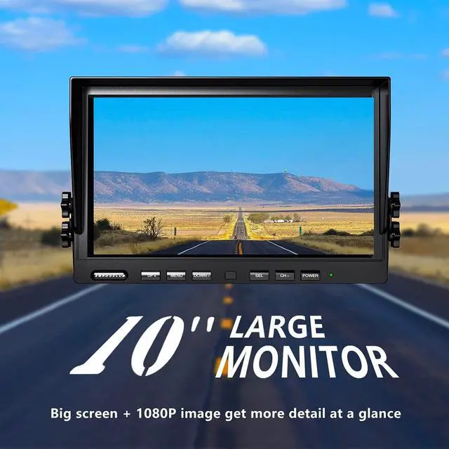 Immersive 10" IPS Display Crystal Clear ViewStep into a superior driving experience with our massive 10-inch super-large monitor. Featuring the latest IPS technology, it delivers stunningly vivid images to ensure the best driving/reversing experience. With a native 1920*1080 Full HD resolution, youll catch every detail, day or night. Universally compatible with 12-24V DC vehicles, its the perfect fit for RVs, Trucks, Trailers, Campers, 5th Wheels, Buses, and Motorhomes. ^^ Upgrade Stable Signal TechnologyUpgraded digital signal receiver for 95mph transmission speed and 130ft transmission distance, give you strong stable wireless signal.