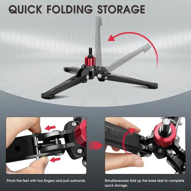 Folding Storage: The connection of the three feet is designed with a quick folding setting. Pinch the feet with two fingers and pull outwards, simultaneously folding up the base feet to complete quick storage