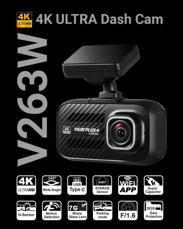 4K ULTRA CLARITY WITH SONY STARVIS SENSOR Capture every road detail in crystal-clear 4K resolution. Equipped with a premium Sony STARVIS sensor, the V263W dash cam delivers superior image quality in both day and night, ensuring license plates and road signs are always visible. ^^ BUILT-IN Wi-Fi & GPS FOR SMARTER CONTROL Easily connect to your smartphone via the dedicated app to preview, download, and share recordings instantly. GPS accurately tracks your driving route, speed, and location perfect for daily commutes or road trips. ^^ 140 WIDE ANGLE & SUPER NIGHT VISION The balanced 140-degree field of view covers three lanes without image distortion.