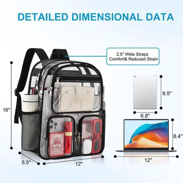 Thickened PVC MaterialCrafted from waterproof and thickened 0.5 mm PVC (polyvinyl chloride), it is sturdy and durable, suitable for daily use. Moreover, the robust PVC tube body and reinforced stitching design enable this clear backpack for girls to maintain a straight shape and bear greater weight ^^ Large-Capacity Clear BackpackMeasuring 16 x 12 x 5.5 inches, its spacious main compartment can easily hold laptops, books and clothes. The internal mesh pocket securely stores keys. The main compartment is equipped with a laptop sleeve, which can fit a 15.6 -inch laptop and an A4 notepad holder.