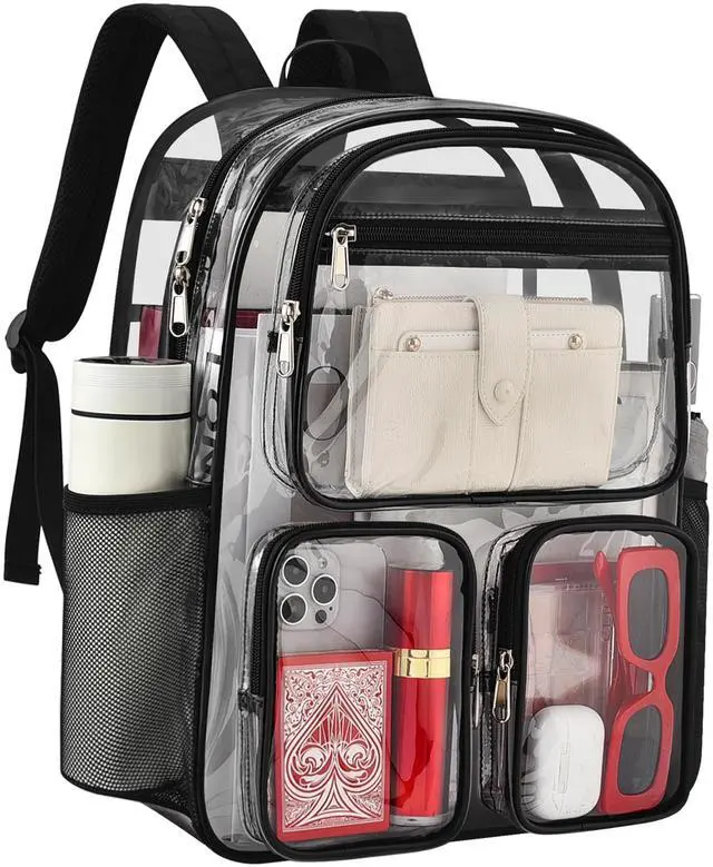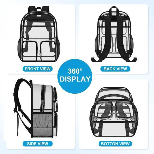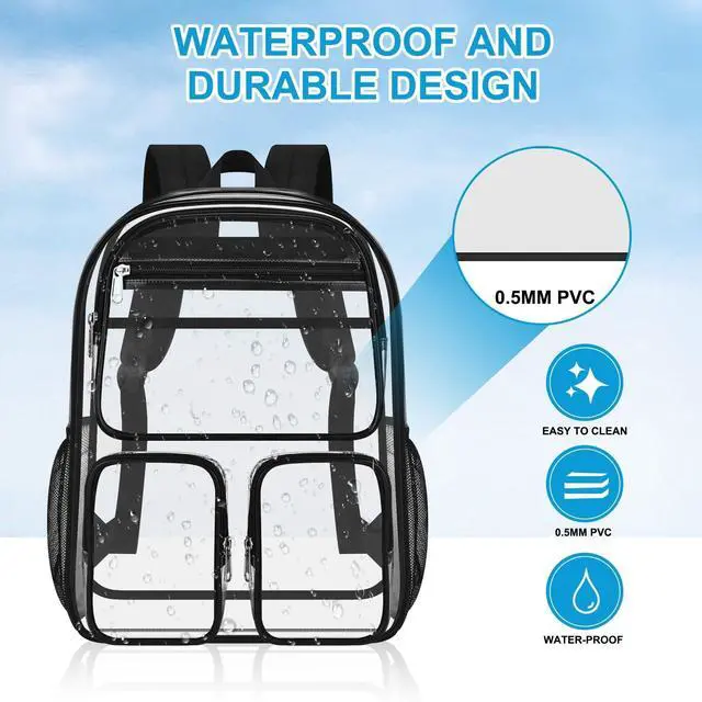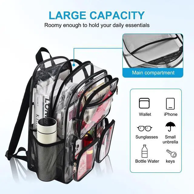 There are front pockets (1 upper pocket and 2 small pockets), and this clear backpack can hold all your daily necessities ^^ Comfortable Shoulder Straps & Sturdy BaseFeaturing reinforced stitching, the zippers of this heavy-duty clear backpack are smooth and flat. This clear backpack for kids is equipped with wide, padded shoulder straps that reduce shoulder pressure when carrying heavy loads. The base of the clear backpack is made of 600D polyester with extra padding, offering strong load-bearing capacity and resistance to tearing ^^ Multiple Uses This convenient clear backpack is suitable for various occasions, such as colleges, workplaces, concerts, airports, sports events, outdoor activities, hiking, camping and beaches.