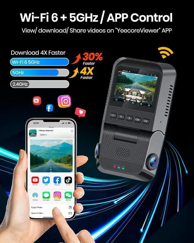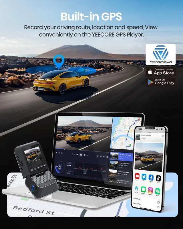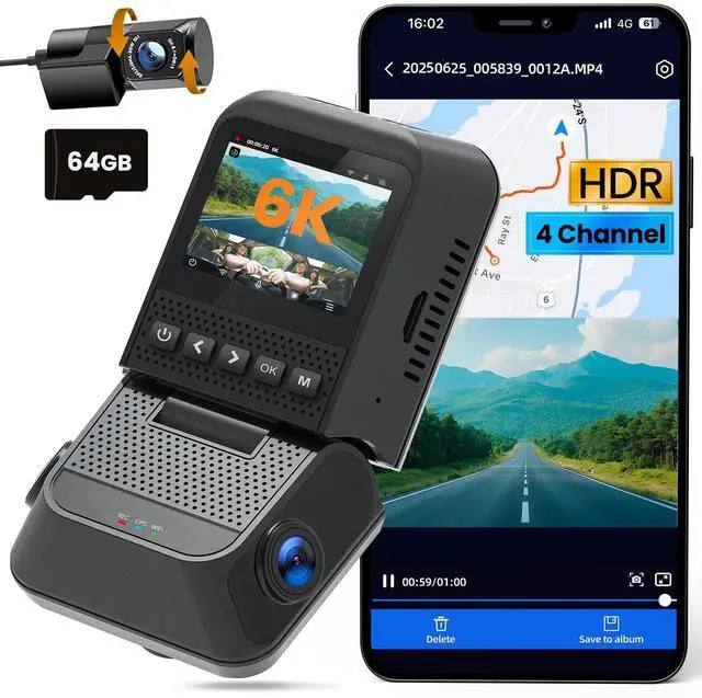 ^^ 5GHz WiFi 6 & Free App ControlThe D64 dashcam boasts built-in 5GHz WiFi 6 for 4x faster connectivity than 2.4GH z (with 2.4GH z support). It pairs with a free app for Android or iOS, enabling seamless control, video preview, download, and sharing. ^^ Built-in GPS LoggerThe D64 car dash camera is equipped with a built-in GPS that accurately pinpoints the vehicle's location, speed (in KMH/MPH), time, and routes on a map in real-time. By installing and using the GPS Video Player, the vehicle's path can be visually tracked, while the coordinates ensure that the exact location of any incident is recorded.