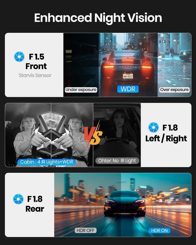 4 Channel Dash Cam, Front Rear Left and Right 360 ViewYEECORE D64 dash cam equipped with a 2.45" IPS screen and 4 lenses, UHD 6K+1K, which can record 360 all-round including front, rear, sides, and interior, providing a wide field of view to capture every road detail. ^^ Super Night VisionThe D64's front left and right cameras boast an F/ 1.5 aperture, 6-layer optics, and WDR tech for balanced exposure in any light, ensuring crisp night footage, capturing details like license plates and faces to safeguard your vehicle.