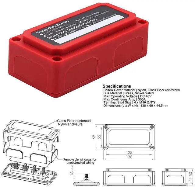300A Busbar with M10(3/8") Terminal Studs; ^^ Module box design with cover for easy wiring configurations.