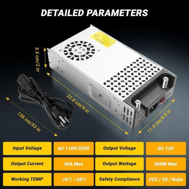 CurrentInput voltage: AC 110V / 220V (85-145V / 185-265V); Output current depends on the device, e. g. DC 12V 10A 120W, 20A 240W, 35A 420W, and the peak current is 50A, peak power 600W. Recommended for equipment below 40A 480W. For resistive device, SMPS peak power device power 1.25 times. For Motor device, the peak power of the SMPS needs to be more than 2 times the power of the Motor. ^^ One-Key OperateWith red button on/off switch function, more safe and convenient power start/stop operation, Switch Transformer build with Imported Aluminum alloy shell, Built-in wire integrated design, Dual power connection methods. ^^ Safety FeaturesAutomatic overload cut-off, over Voltage cut-off, automatic thermal cut-off, short circuit protection. High Reliability, Low Temperature Rise, Built-in EMI filter, 100% Full load burn-in Tested. ^^ Includ Clamps and Copper Wire12V 50A 600W Power Supply converter with ul power cord, wire lugs, metal clip and screw. Dial to the correct gear position, cut off the power before disassembling the connection ^^ Applications WidelySimultaneous power supplies for devices different currents/watts.