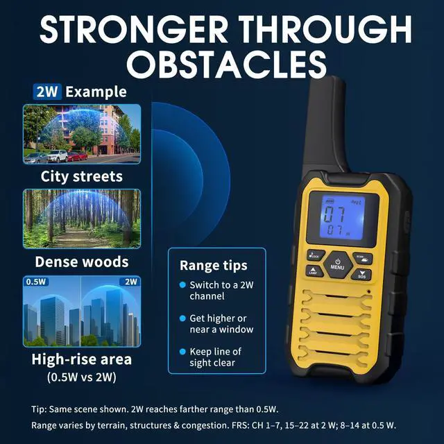 Quick-Pair in seconds Press one key to sync and talk; ideal for classrooms, church ushers, event staff, warehouses and camping caravans. ^^ Clearer indoors with 2W FRS Stronger coverage through halls, aisles and high-rise corridors; switch to a less-crowded channel and add a privacy code to cut cross-talk. ^^ Rechargeable power that lasts Each radio includes 31500mAh AA NiMH; auto battery-save helps support all-day use. ^^ USB-C split charging 1-to-2 USB-C cable charges two radios from one port (power bank, car or wall) for quick top-ups on the go.