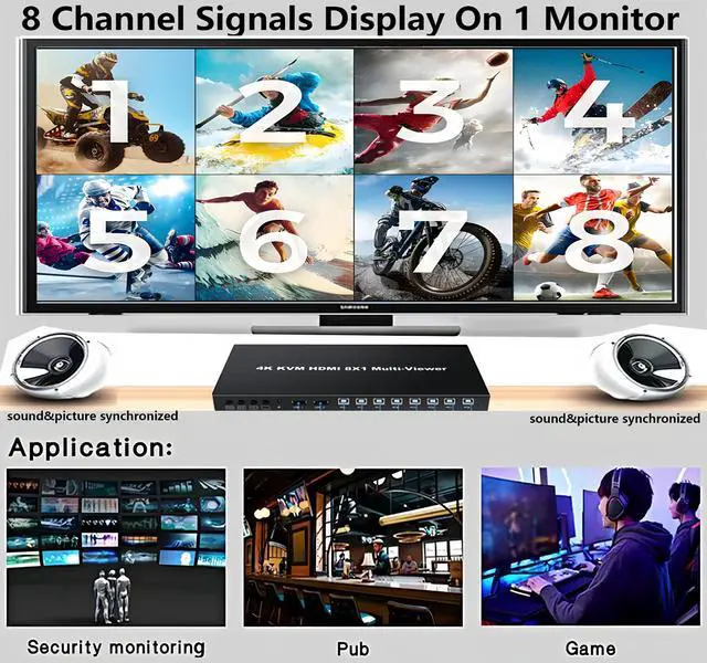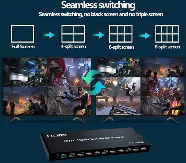 HDMI 8 in 1 out/PC 8 in 1 outThis KVM HDMI Multiviewer 8X1 Supports 8 HDMI inputs 1 HDMI output or 8PC inputs 1 HDMI output; It can display 8HD digital video signal on the same screen. ^^ 16 display modesThis KVM HDMI Multiviewer 8X1