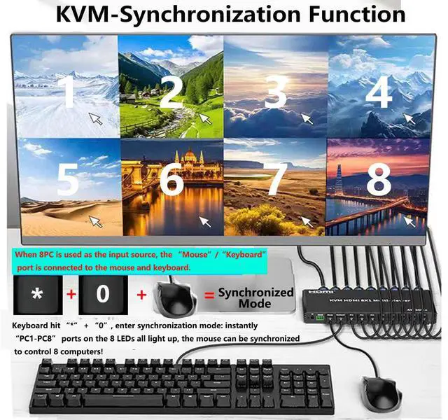 Support KVM Exclusive Features: 8 computers can share 1 set of mouse and keyboard (Only applicable when 8PC is used as the input source and the Mouse/Keboard port is connected to the mouse and keyboard). ^^ KVM synchronization functionWhen 8PCs are used as the input source and the Mouse/Keboard port is connected to the mouse and keyboar: Keyboar dclick'*'+'0' to enter the synchronization mode, Mouse can control 8 computers simultaneously. ^^ Mouse through functionWhen 8PCs are used as the input source and the Mouse/Keboard port is connected to the mouse and keyboar: Keyboar click *+S to enter the Mouse through mode, Mouse can be moved anywhere between PC1-PC8 for use. ^^ 4K HDInput resolution the highest support 4K/30Hz; Output resolution Supports 4K@30Hz/2560x1600/2560x1440/1080P. ^^ standard AWG26 HDMI cableThis KVM HDMI Multiviewer 8X1 Support standard AWG26 HDMI cable. ^^ Wide compatibilityThis KVM HDMI Multiviewer 8X1 supports WindowsMAC OS and Android operation system etc; No driver installation required, Plug and play.