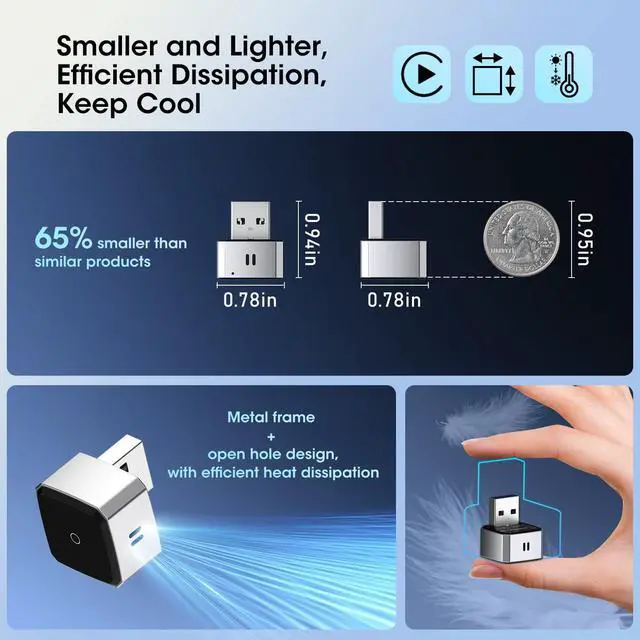 Plug and PlayJust plug the wireless carplay adapter into your car's USB port, and it converts wired to wireless carplay via bluetooth and wifi. Next use will auto-connects. The wireless carplay adapter for iphone could use navigation, calls, music, messaging, also all carplay-supported apps while driving ^^ Stable Connection AdvantageThe usb carplay wireless adapter equipped with A9 chip, Bluetooth 5.0, WiFi 5.8GH z, so the carplay adapter could 5s connection. This wireless carplay adapter uses a metal frame + open hole design, with efficient heat dissipation, could keep smooth and unstuck when running apps ^^ Stylish and StableThe mini wireless carplay adapter 65% smaller than similar car play adapters, and the apple carplay is even lighter! Also the carplays wireless design allows you to say goodbye to the messy wired countertops and have a neat interior.