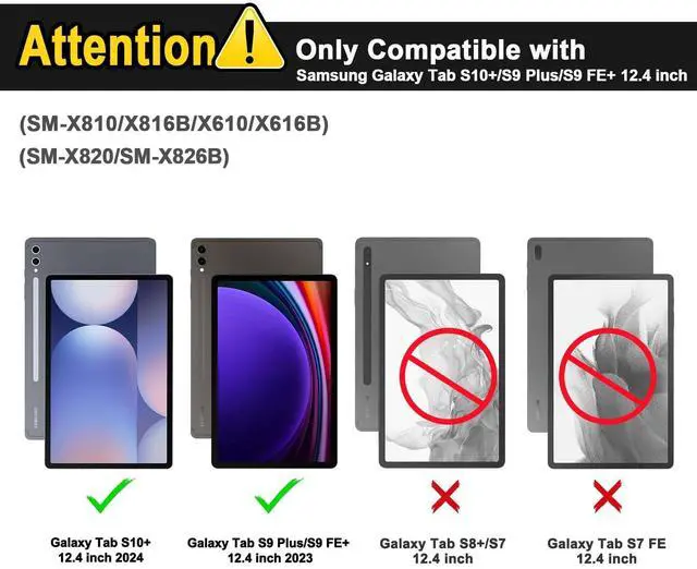 Attention CompatibilityCompatible with Samsung Galaxy Tab S10+ 12.4 inch 2024(Model: SM-X820/SM-X826B), Samsung Galaxy Tab S9+/S9 Plus 12.4 inch 2023(Model: X810/X816B/X818U). Please kindly check the model number SM-T*** on the tablet Settings before purchase. ^^ Convenient ShortcutsThis samsung galaxy tab s10 plus/s9 plus wireless keyboard has multifunctional shortcuts that allow you to capture a screenshot, lock the screen, or change the volume with a single touch. By combining FN with other buttons, you can make your tablet as useful as a laptop. ^^ Multifunctional KeyboardsThis detachable keyboard is compatible with iOS, Android, and Windows systems, as well as your other devices. The charging port type-C is more convenient and quicker. ^^ Full ProtectionThe premium synthetic leather outer layer shields your tablet from accidental drops and shocks, while the smooth non-slip inside layer shields it from scratches. ^^ Multiple Viewing AnglesThis Samsung tab S10+/S9+ cover has non-slip grooves and three viewing angles. You can adjust to the optimal angle for studying, working, or entertaining.