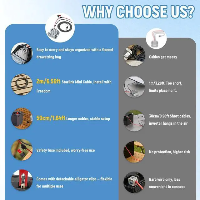 What you will get: Starlink Mini DC step up power supply*1, a flannel drawstring bag, an extral safety fuse, detachable alligator clips*2. Our Battery booster for starlink mini dc adapter have a longer cable, which is 6.56 ft starlink mini cable, install with Freedom. Providing 12 months warranty