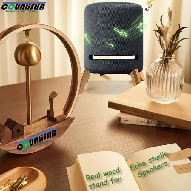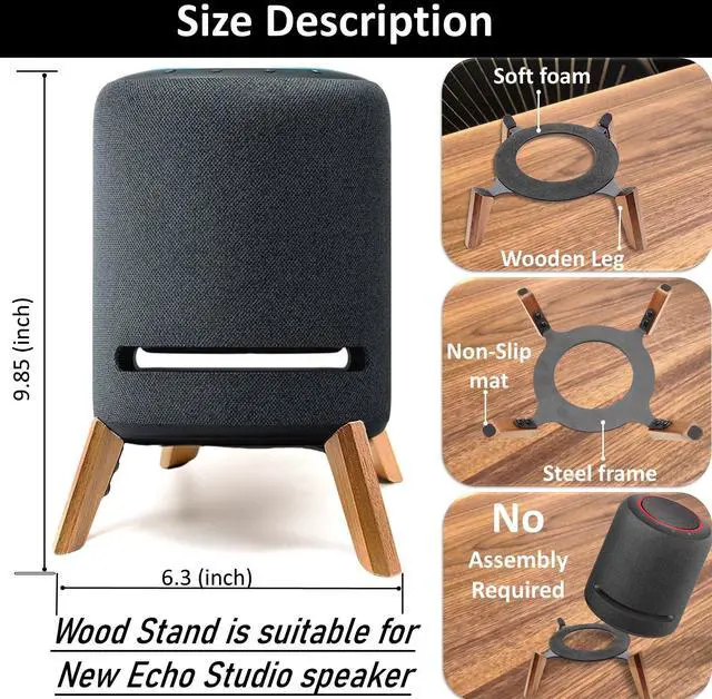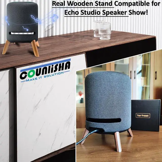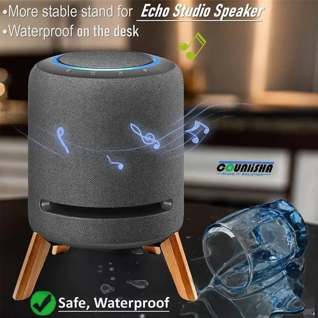 (Notes: studio speaker device is not included in this order. ) ^^ 6, waterproof holder for speaker on table wooden holder height is very suitable to support the echo studio speaker, avoide the erosion by water on desktop or soup in kitchen. The wooden feet firmly fit the studio speaker, and spot will not slide, making it very reliable.