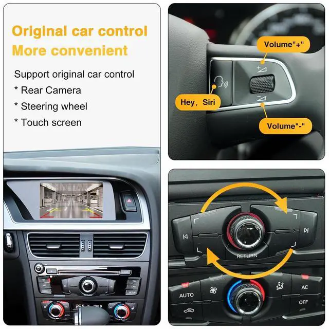 Support Waze and sygic map, etc, listen to your favorite songs using iTunes, Apple Music or other apps and access to messages. Support fatory original reverse camera, parking radar, aftermarket reverse camera and 360 camera; Support front view camera DVR (CVBS input). ^^ Support Steering Wheel Buttons and Car Knob ControlSupport the Siri button, telephone button, and voice + - buttons on the steering wheel, but other buttons on the steering wheel are not supported. You can switch between the NTG system and our Carplay system using the car knob, which is more convenient while driving.