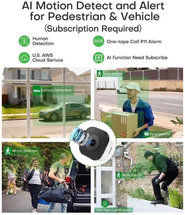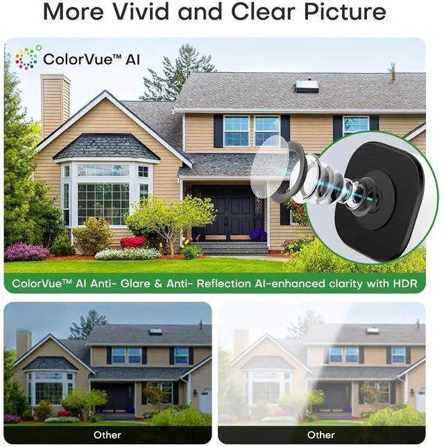 VIDEO DAY & NIGHT: Capture sharp, detailed video in 5MP QHD resolution, allowing you to see important details like faces and license plates with clarity. The ColorVue AI technology and specialized anti-reflection lens are engineered to provide vibrant, full-color footage even in low light, directly through your window glass. Monitor your property 24/7 without the blurry, black-and-white images produced by standard infrared night vision ^^ LOCAL SD CARD & CLOUD STORAGE OPTIONS Use main features of your cameras without being locked into a mandatory subscription. Record footage continuously to a local microSD card (sold separately) for a private solution. For added backup and remote accessibility, an optional subscription for secure A. W. S. U. S Cloud storage is also available. You remain in complete control of video data ^^ SMART AI DETECTION WITH INSTANT ALERTS: Reduce unwanted notifications with intelligent AI processing that accurately distinguishes human motion from the movement of pets, shadows, or passing cars. Receive immediate alerts directly to your smartphone when a person is detected. Use the built-in two-way audio feature via the mobile app, adding another security while calling 911( (AI core function need subscription) ^^