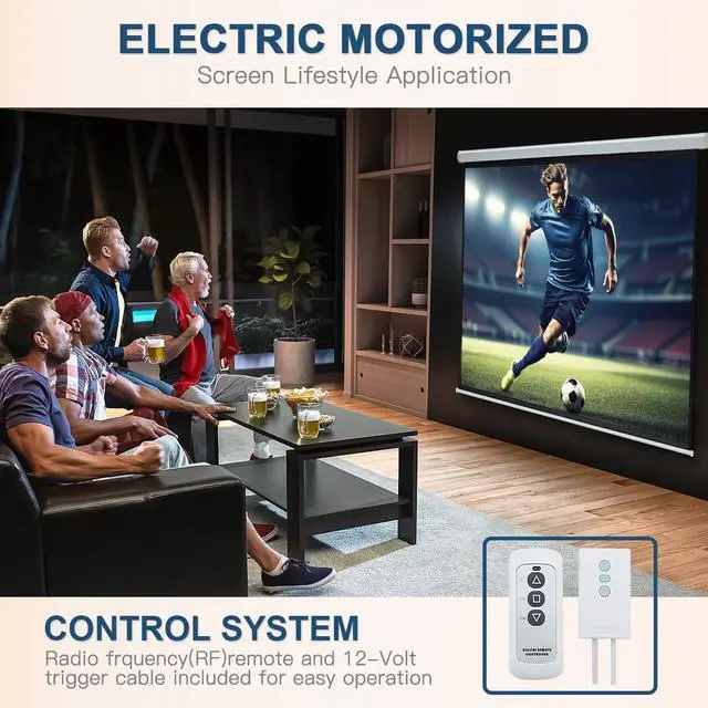Smooth Auto-Lock Mechanism - New added self locking design, the electric projector screen can be fixed at the length you want at any time. The ultra-quiet motor drop down and roll up the screen smoothly without jamming and has a long service life. Rolling storage, reduce wrinkle generation. The electric drop down projector screen with wired and wireless remote controls help to adapt to different conditions, drop and risen with one click. ^^ Multi-scenes Application - 4:3 aspect ratio, 100" diagonal length. This motorized projector screen is a must-have for home theater, school, business office, wedding.