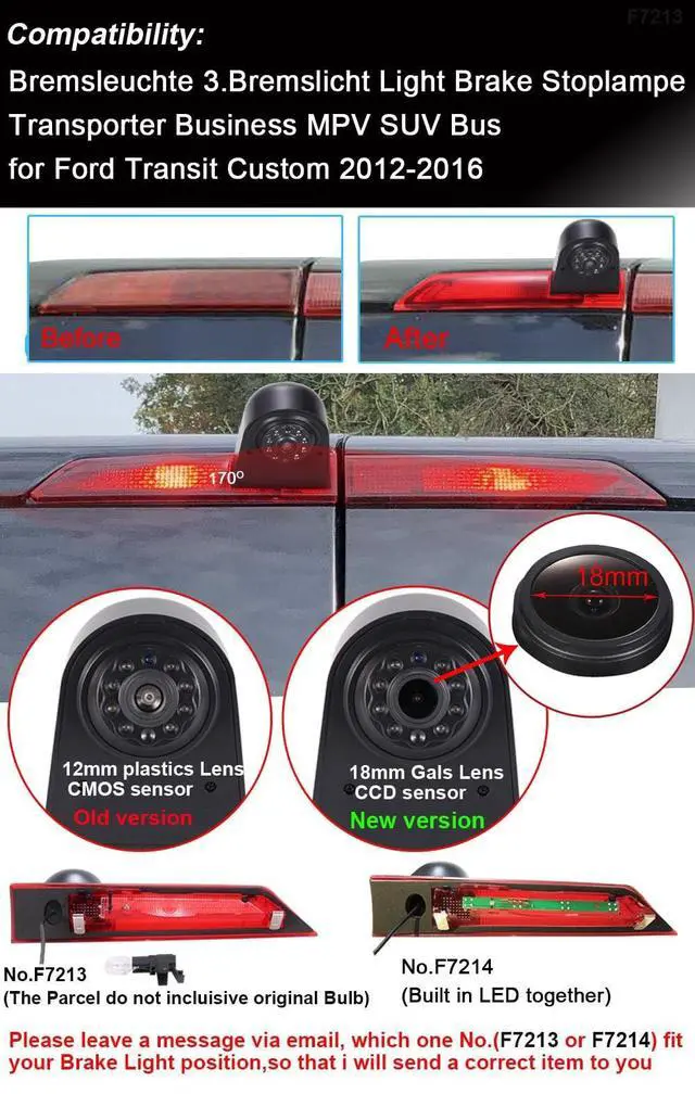 ^^ Adjustable Lens Angle: The lens angle of the rear view camera can be adjusted, making it easy to adapt the perspective to different vehicles and loading situations to better observe the situation behind the vehicle. ^^ Plug and Play, Tailor-made models for original carsReplacement for Ford Transit Custom 2012-2016