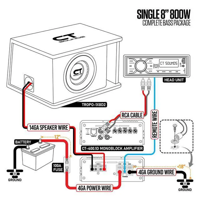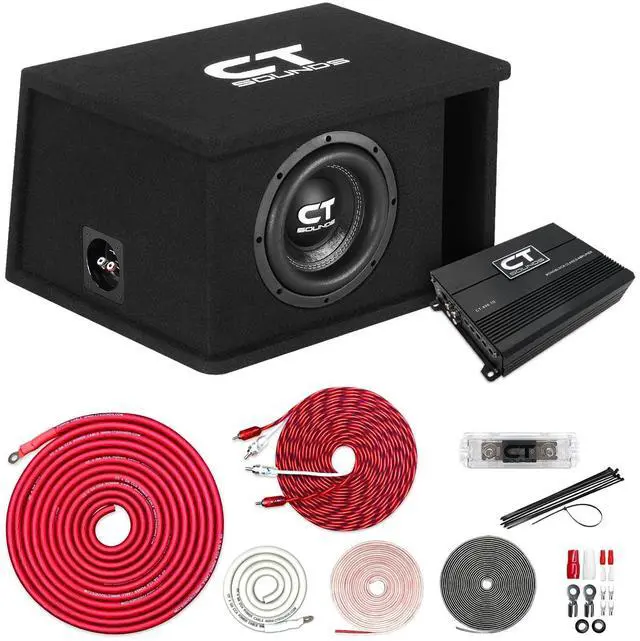 The CT Sounds TROPO-1X8D2 complete bass package takes the guesswork out of finding the perfect amplifier, subwoofer, and enclosure for your system. The bass package features our TROPO-8-D2 800-watt max power 8-inch car subwoofer, which comes pre-installed flush into the 1.25 front baffle of the subwoofer box using claw nuts and fasteners, ensuring an air-tight seal. To complete the package, we include our CT- 400.1D 400-watt rms amplifier and 4-gauge amplifier wiring kit - a true plug-and-play system!