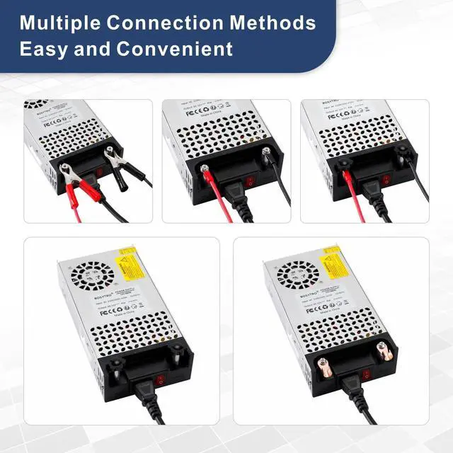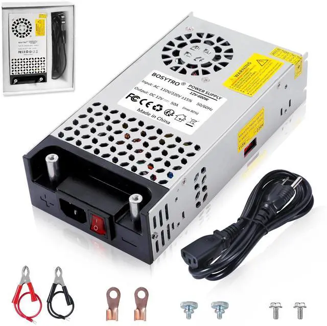 Ac to Dc ConverterInput voltage 110v-240v ac, output voltage 12v dc; Output current Mainly depends on your decive, such as DC 10A/120W, 20A/240W, 40A/480W, 50A/600w, max current up to 50A, max output power 600W ^^ Easy OperationCompared to traditional multiline connection methods, this new version 600w power converter design with two nickel-plated copper terminal, which can be directly connect by clamps, convenient and easy, and it has good electrical conductivity and high conversion efficiency, corrosion resistance, aging resistant ^^ Intelligent Cooling SystemThe DC power supply with aluminum alloy shell and designed with multiple holes for better heat dissipation, Built-in Cooling Fan to prevent overheating and burning of circuit boards; moreover, Anti-skid pads are added to the bottom, which can also make the bottom better heat dissipation and work more stable ^^ Multiple ProtectionBOSYTRO 12 volt power supply features a overload protection, over-current protection, over-temperature protection, short circuit protection which can protect your device from damage.