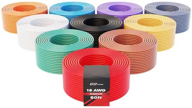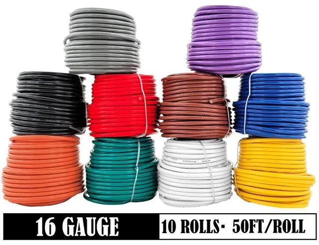 Primary automotive wire assortment: 16 AWG wire x 10 rolls, 16Ga wire in 50ft roll total of 500ft. This electrical wire comes conveniently in 10 different colors. Speaker wire 16 gauge. ^^ Single Conductor 16 gauge wire automotive, Stranded Copper Clad Aluminum ( 0.2 mm dia/strand, 42 strands) Insulated in flexible PVC electrical wire. This automotive wire 16 gauge is rated at 221 F/ 105 C. ^^ CCA wire is low cost, lighter and more flexible than copper wire. This flexible 16 gauge automotive wire is perfect for 12 volt wire. 12V auto wire is made of top quality Copper Clad Aluminum.
