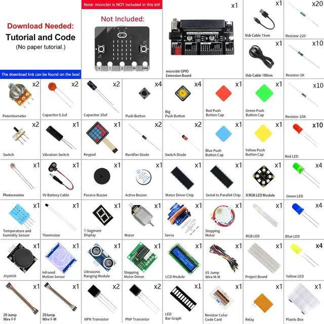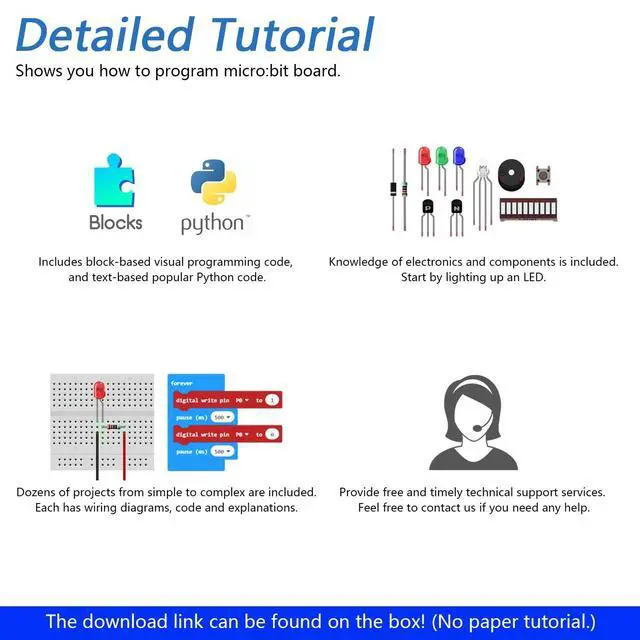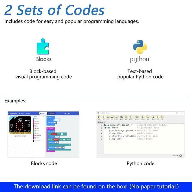 Tutorial and Code: Comes with detailed tutorial and Blocks, Python code. (Download needed, no paper tutorial. )Blocks is an easy to use visual programming language and Python is very popular. The download link can be found on the product box. Contents of Blocks /