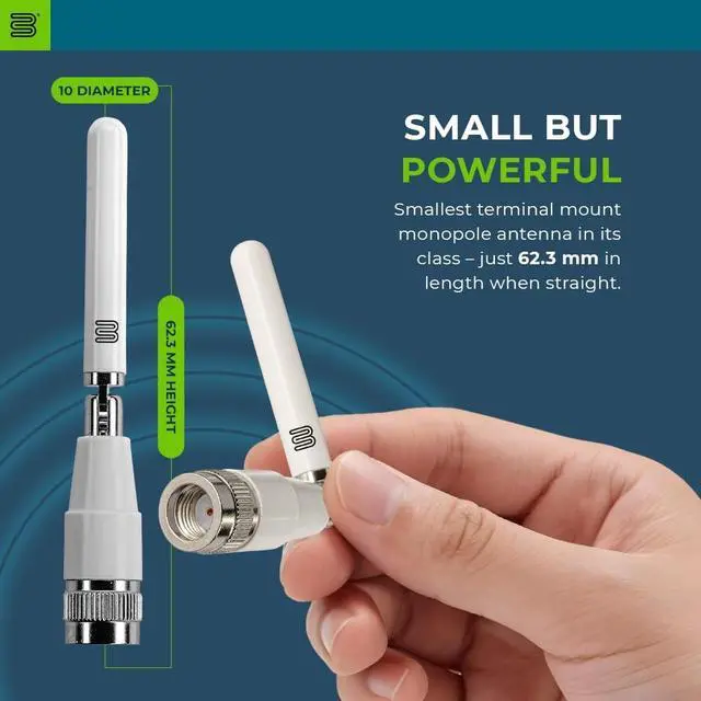 ^^ COMPACT DESIGN: Smallest terminal mount monopole antenna in its class just 62.3 mm in length when straight.
