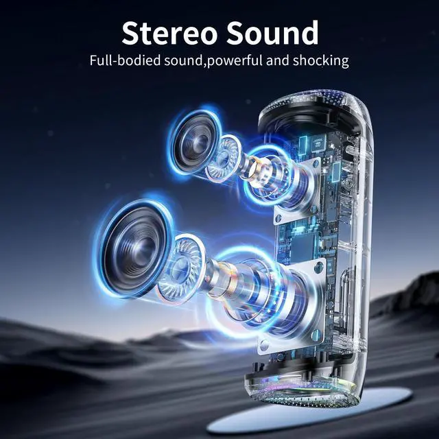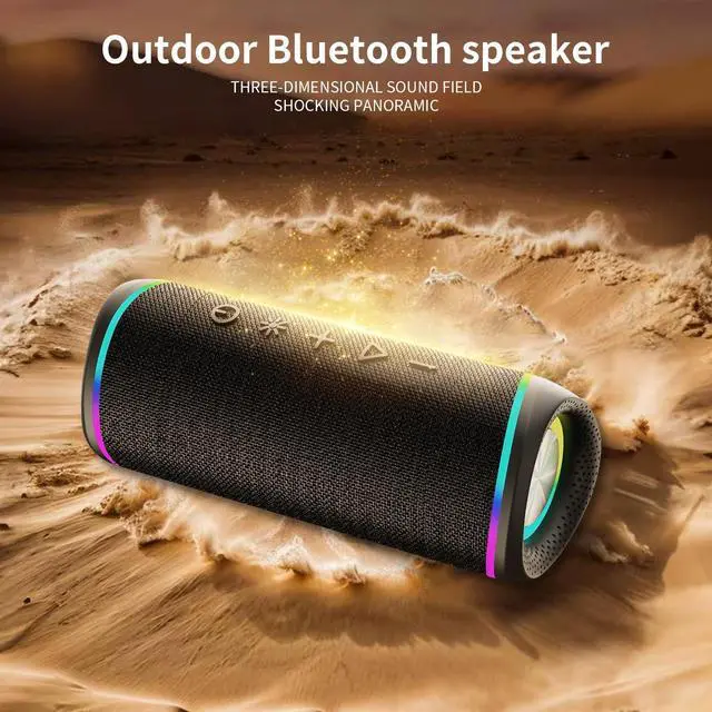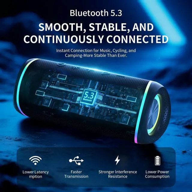 & Enjoy exceptional sound quality with this wireless Bluetooth speaker, featuring dual drivers and advanced audio technology that deliver powerful, well-balanced sound with minimal distortion. For an enhanced audio experience, pair two speakers together to create immersive stereo soundperfect for gaming, music, and movie playback ^^ & Enjoy up to 20 hours of playtime per charge (at 50% volume with lights off) and stable wireless performance with Bluetooth 5.3, offering a connection range of up to 33 feet. Easily turn off the speakers lights to conserve battery life. Please note that actual playtime may vary depending on volume, audio content, and usage habits ^^ & -Designed for durability, this speaker boasts a tough build and an IPX5 water-resistant rating, making it ideal for rough use and outdoor environments.