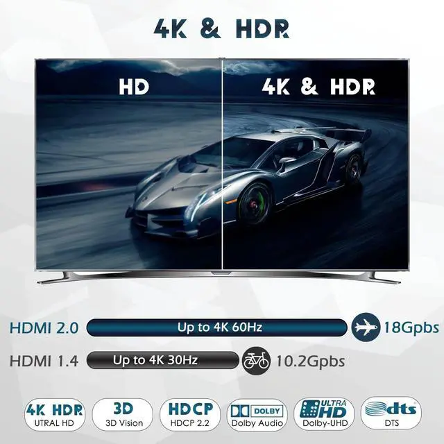 RGB 4:4: 4, 3840x2160p, 3D, and 480i@60Hz/ 480p@60Hz/ 576i@50Hz/ 576p@50Hz/ 720p@50/ 60Hz/ 1080i@50/60Hz/ 1080p@50/60Hz/ 1080P 24Hz 3D/720 60Hz /4K@60HZ HDMI 2.0 b, HDCP 2.2 ^^ Long Distance HDMI Transmission and Easy to
