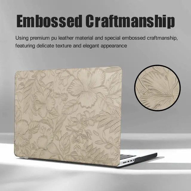 PREMIUM MATERIAL: Elegant Leather Mac Book Air 15 Case is made from premium, scratch resistance pu leather and impact resistance pc material, the surface is covered with embossed leaves and floral, forming a protective layer similar to "ultra-thin armor", it can effectively protect your device from fingerprints, scratches, shocks, dents and other damages. Coming with silicone keyboard cover to prevent keyboard from food crumbs, liquid spills and key wear ^^