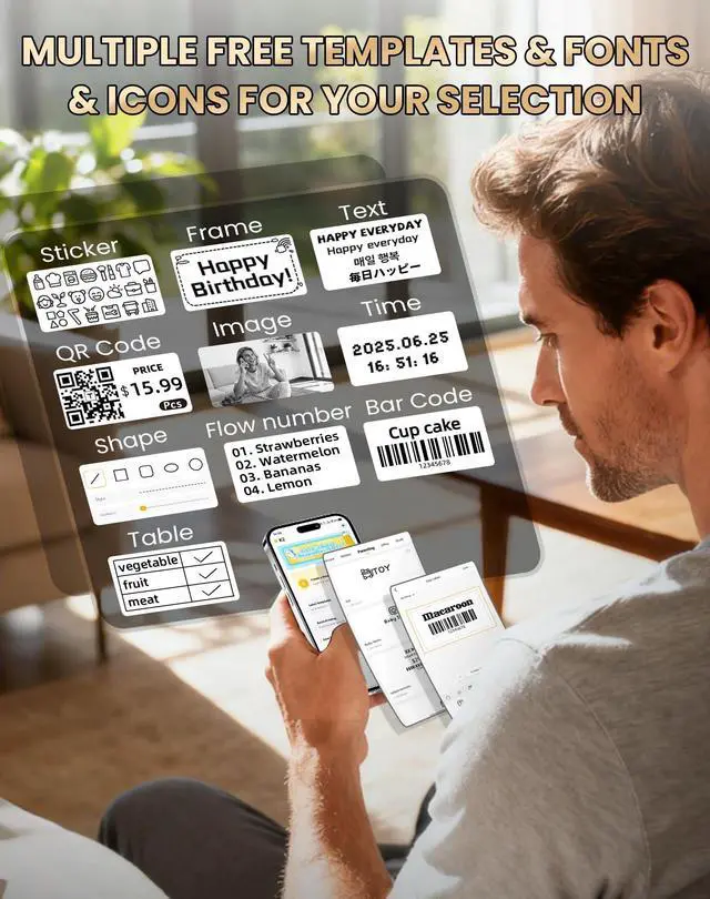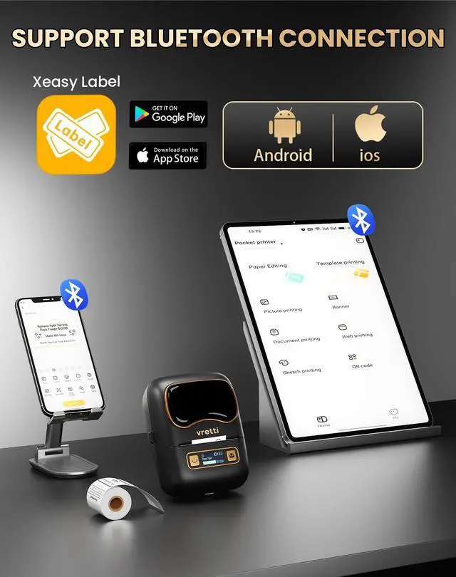 Easy to use: Our label maker machine with tape supports IOS & Android, by connecting this portable label printer via Bluetooth on your phone or tablet, with many templates in the app for you to choose from, you can easily print any label you needs. Such as barcode, clothing labels, price labels, cable labels, jewelry labels, address labels, file folder labels, waterproof labels etc.