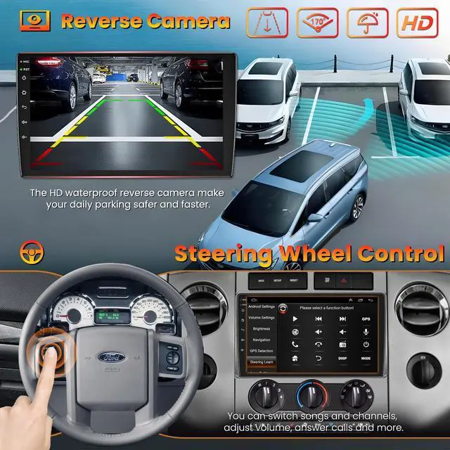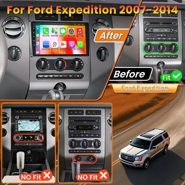 (Note: We have equipped this car stereo with the latest HD rearview camera, it may not be compatible with some models, if the camera does not work, please contact us, we will send you a replacement camera for free) ^^ Gorgeous IPS Display & UI Themes9-inch IPS touch screen with 1280 * 720 HD resolution display provides you with true-to-life colors from any angle. The Expedition car stereo built-in many sets of UI themes. You could switch different styles of screen themes according to your preferences, just like owning another brand new car stereo. ^^ Powerful FunctionsCar radio for Ford Expedition with Android 13 system, equipped with Quad Core CPU, 4GB RAM+64GB ROM provides a smooth and responsive user experience. Support CarPlay, Android Auto, GPS navigation, Bluetooth, FM radio, EQ Settings, WiFi Connection, Backup Camera, USB, multi-format music player, 1080p video player, video and audio output, external microphone, steering wheel control. ^^ Support Full RCA Output & Split ScreenDouble Din Android 13 Car Radio comes with video output and Supports split-screen function. Supports car headrest video output, your family or friends could enjoy videos in the backseat.