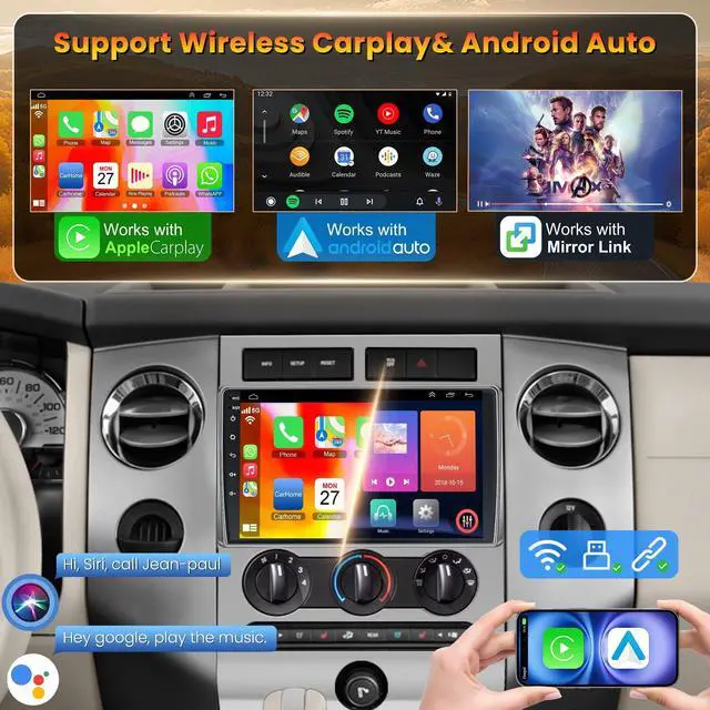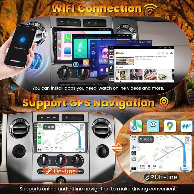 Wired/Wireless CarPlay & Android AutoAndroid 13 car stereo for Ford Expedition 2007-2014 supports wired/wireless Apple CarPlay and Android Auto, With wired connection or wireless connection through Bluetooth, you could more easily access the apps of your phone. You can also able to wake up the voice assistant Siri or Google Assistant to operate Apps on your phone, easily use GPS navigation, calls, message, music, and much more functions while keeping your hands free for safe driving. ^^ GPS Navigation & HD Backup CameraDual navigation system that supports offline and online maps.