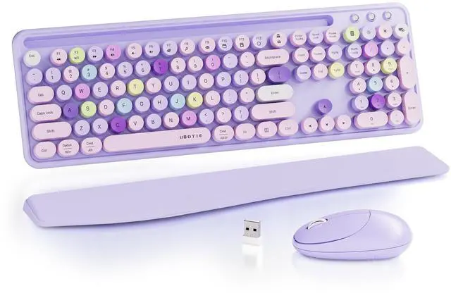 UBOTIE Wireless Keyboard and Mouse Combo with Phone Holder Wrist Rest, Round Colorful Keys, Power Switches, 2.4GHz USB Receiver, Full-Size QWERTY Layout for PC Laptop(Purple Colorful)