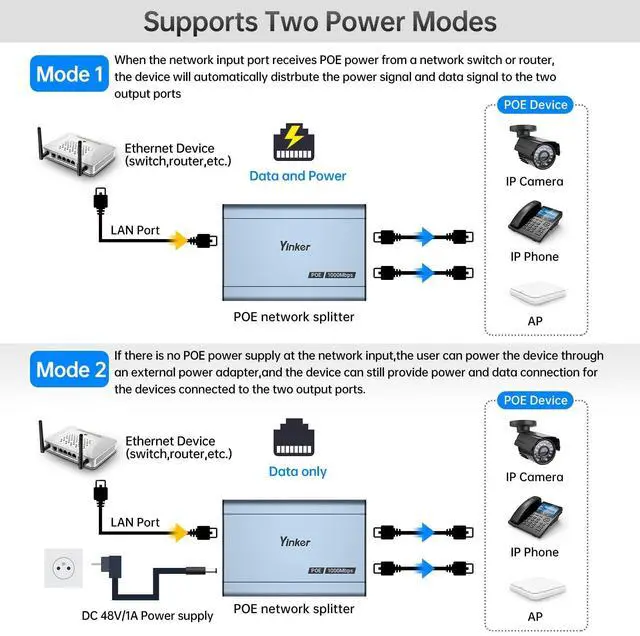 ^^ Package: 1 to 2 port POE splitter *1, USB power cable *1. Any questions, please welcome contact YinkerOfficial for support. Warm Notes1. Connect with a POE switch, no power adapter is require 2. Connect with a common network switch(non-POE function), please plug in a 48V1A power adapter 3. If use it as a regular network expansion, a 5V1A power adapter is needed.