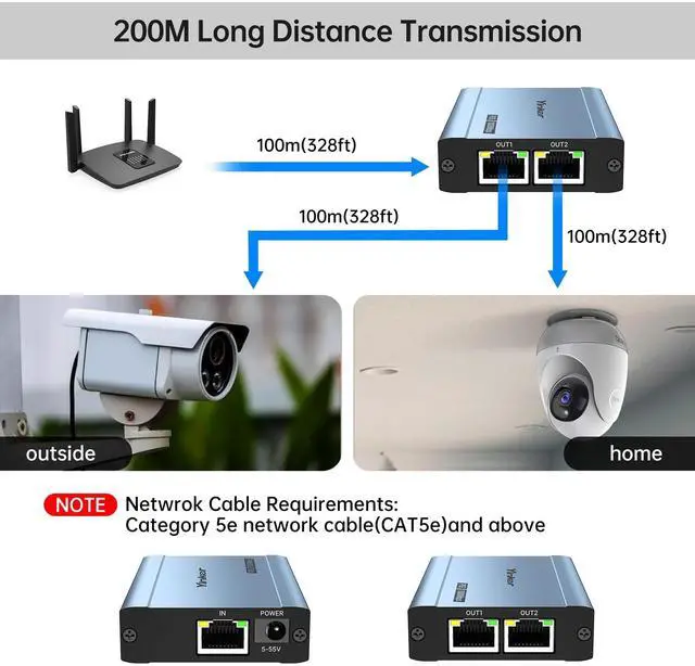 Yinker POE Ethernet Splitter 1 to 2, allow transfer one POE switch port into 2 POE devices(like POE IP Webcam, IP Speaker, IP Phone, etc. ) and share the 1000Mbps high speed at the same time. No extra power reuqired. ^^ 200m-Long Range Transmission. When connecting with POE device, can extend your network up to 200m (656ft) without signal loss. Compatible with Cat5/5e/6/7/8 cable. Cat6+ cable is recommended. ^^ Total 60W Output. With adequate power supply (POE supply or 48V1A power adapter), this POE splitter can output max 30W each port with a total of 60W, ensure a stable and smooth transmission.
