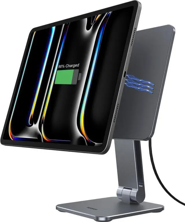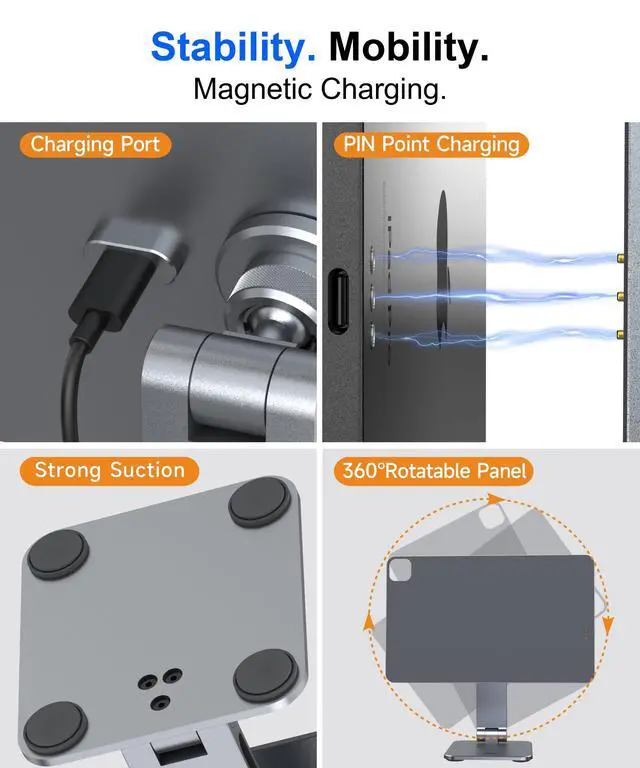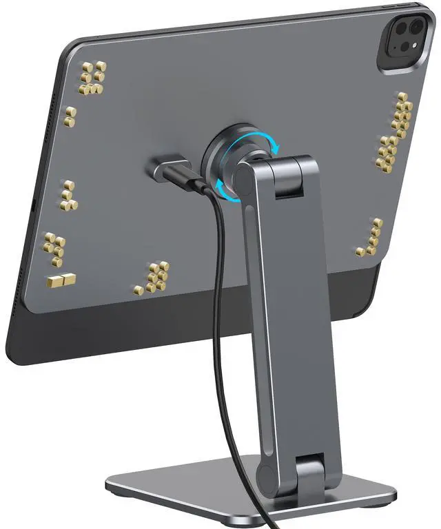 Magnetic iPad Stand with Wireless ChargingExperience next-level convenience with YICOSUN Magnetic iPad Stand featuring 35W PIN contact fast charging. Strong magnetic alignment keeps your iPad Pro 11 M5 / M4 powered while working, studying, drawing or streaming. ^^ Aluminum Alloy Body & Suction Cup BaseBuilt with premium aluminum alloy and a reinforced suction cup base, this magnetic iPad stand ensures durability and rock-solid stability. No wobbling, even during intensive creative use. ^^ 360 Rotating Panel & Adjustable AnglesRotate, tilt, or detach with ease. The 360 rotating panel and metal damping shaft provide smooth adjustments, letting you switch between angles seamlessly for multitasking.