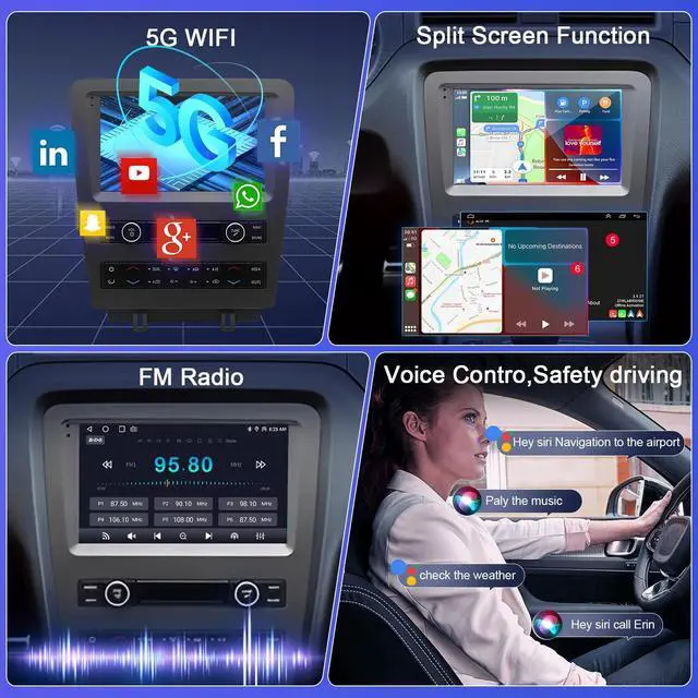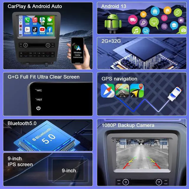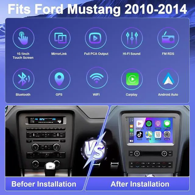 Vehicle Compatibility: 9Inch Car-play Car Stereo Radio GPS Navi Android 13 Compatible for Mustang 2010-2014 Android 13 See the picture for more applicable models. Please check the year, dimensions and shape of the center console of your vehicles before purchasing. It ensures a perfect fit with your vehicle's center console ^^ Android 13 System AHD camera + microphone& 2+32